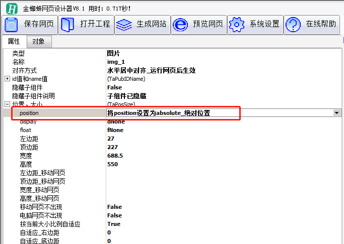 这里所说的position是指“位置、大小”->“position”,对应html元素的position属性。金蜘蛛网页设计器的“位置、大小”->“position”有6个选项:将position设置为absolute_绝对位置, 将position设置为relative_相对前一元素底部, 将position设置为inherit_继承父元素position, 将position设置为fixed_固定位置, 将position设置为static, 不设置。 其中选项“不设置”则会默认为“将position设置为relative_相对前一元素底部”,“将position设置为fixed_固定位置”和“将position设置为static”一般用在特别情况下。而最常用的就是“将position设置为relative_相对前一元素底部”和“将position设置为absolute_绝对位置”。